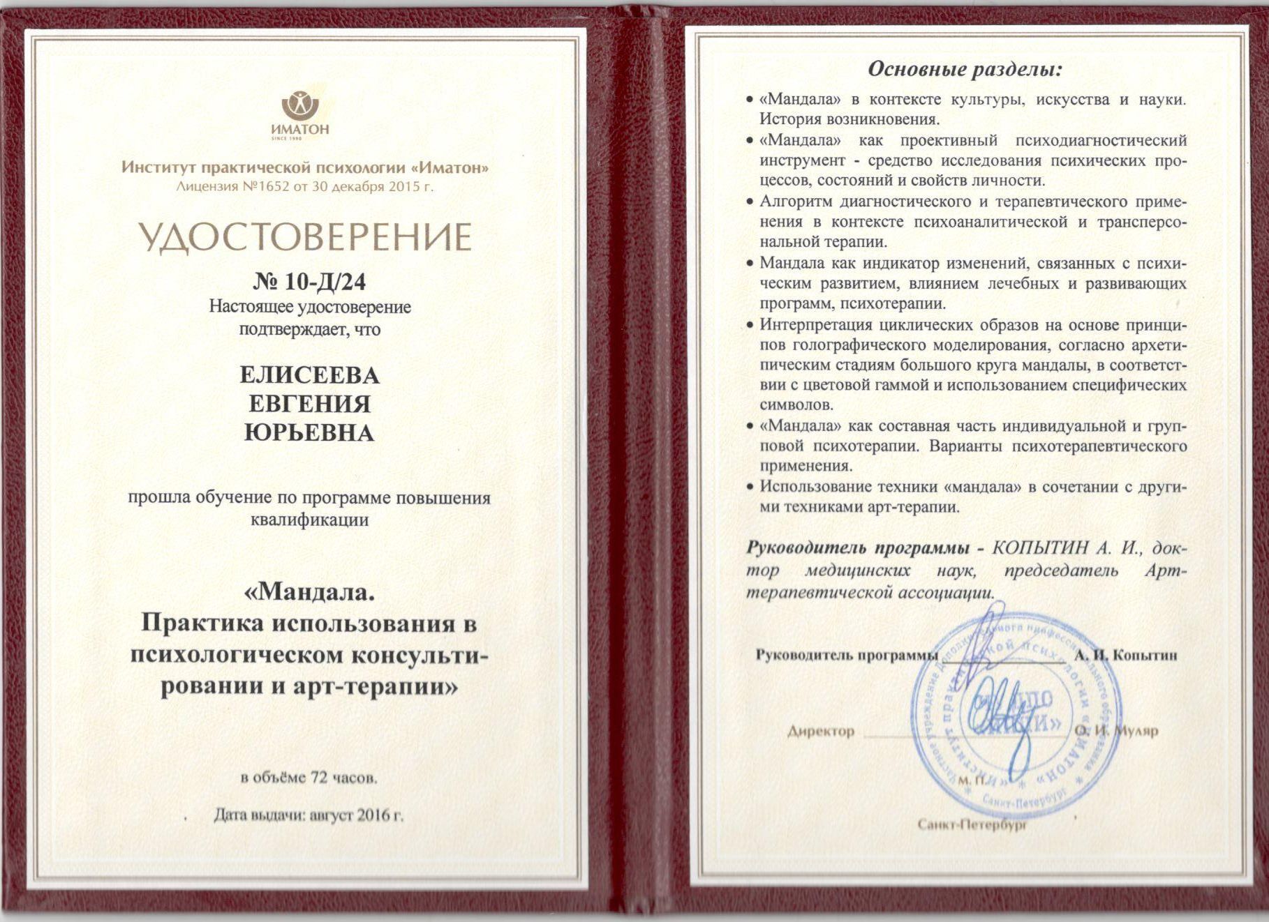 Прошла курсы Мандала - Волшебство Преображения, Мандала Рода, Путешествие в страну здоровья, Молодости и Долголетия. Сказкотерапия. Само перечисление курсов говорит за себя. Сначала пошла на первый Мандала - Волшебство Преображения. Очень понравился. Живо, интересно, информативно. А главное это творчество.